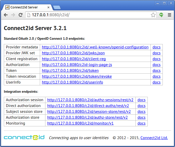 You should then see a banner page, listing the standard OAuth 2.0 / OpenID Connect endpoints provided by the server. There’s also a list of the special web interfaces for plugging in various server components and management tools.