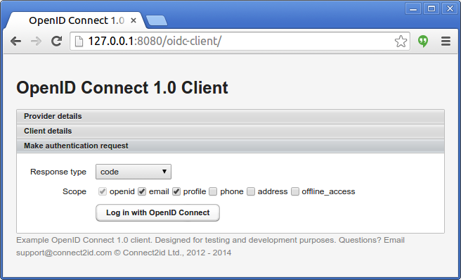 Point your favourite web browser to the URL of the example OpenID Connect to test authentication and UserInfo retrieval with the Connect2id server:
