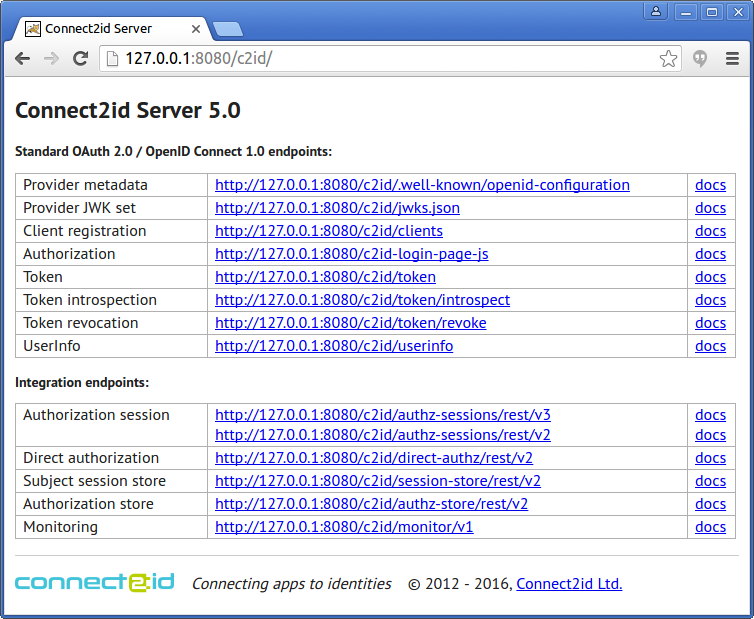 You should then see a banner page, listing the standard OAuth 2.0 / OpenID Connect endpoints provided by the server. There’s also a list of the special web interfaces for plugging in various server components and management tools.