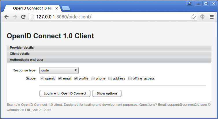 Point your favourite web browser to the URL of the example OpenID Connect to test authentication and UserInfo retrieval with the Connect2id server: