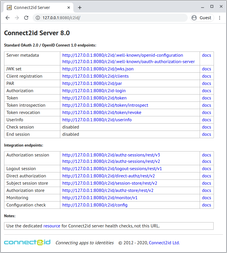 You should see a banner page, listing the standard OAuth 2.0 / OpenID Connect endpoints provided by the server. There’s also a list of server web APIs for integrating UIs and custom components.