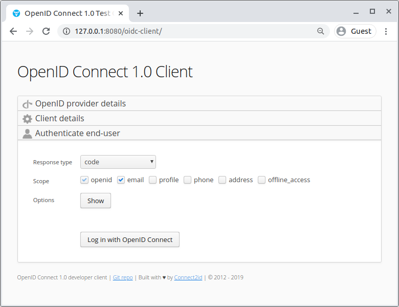 Launch the example OpenID Connect client to test authentication and UserInfo retrieval with the Connect2id server: